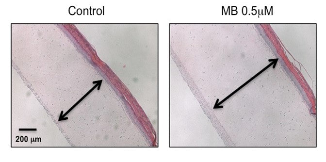 These cross-section images show three-dimensional human skin models made of living skin cells. The Untreated model skin (left panel) shows a thinner dermis layer compared with model skin treated with Methylene Blue (right panel) for 2 weeks - an increase in skin hydration and overall thickness.