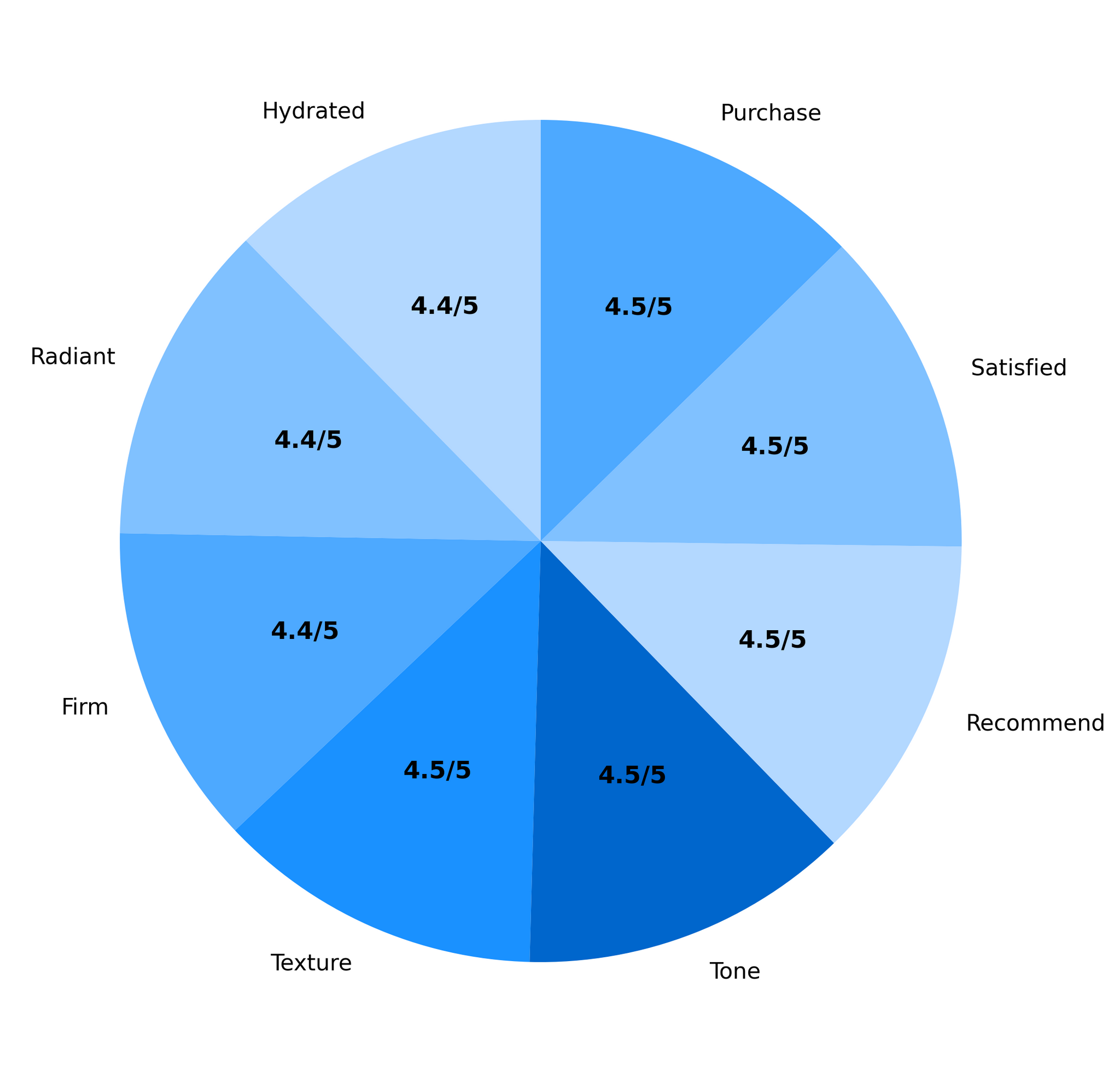 This chart shows that participants reported consistently high ratings across all skin improvement areas, averaging between 4.4 and 4.5 out of 5. The strongest results were observed in skin tone, texture, and purchase intent, highlighting visible rejuvenation and strong satisfaction with the Fit+Firm's performance.